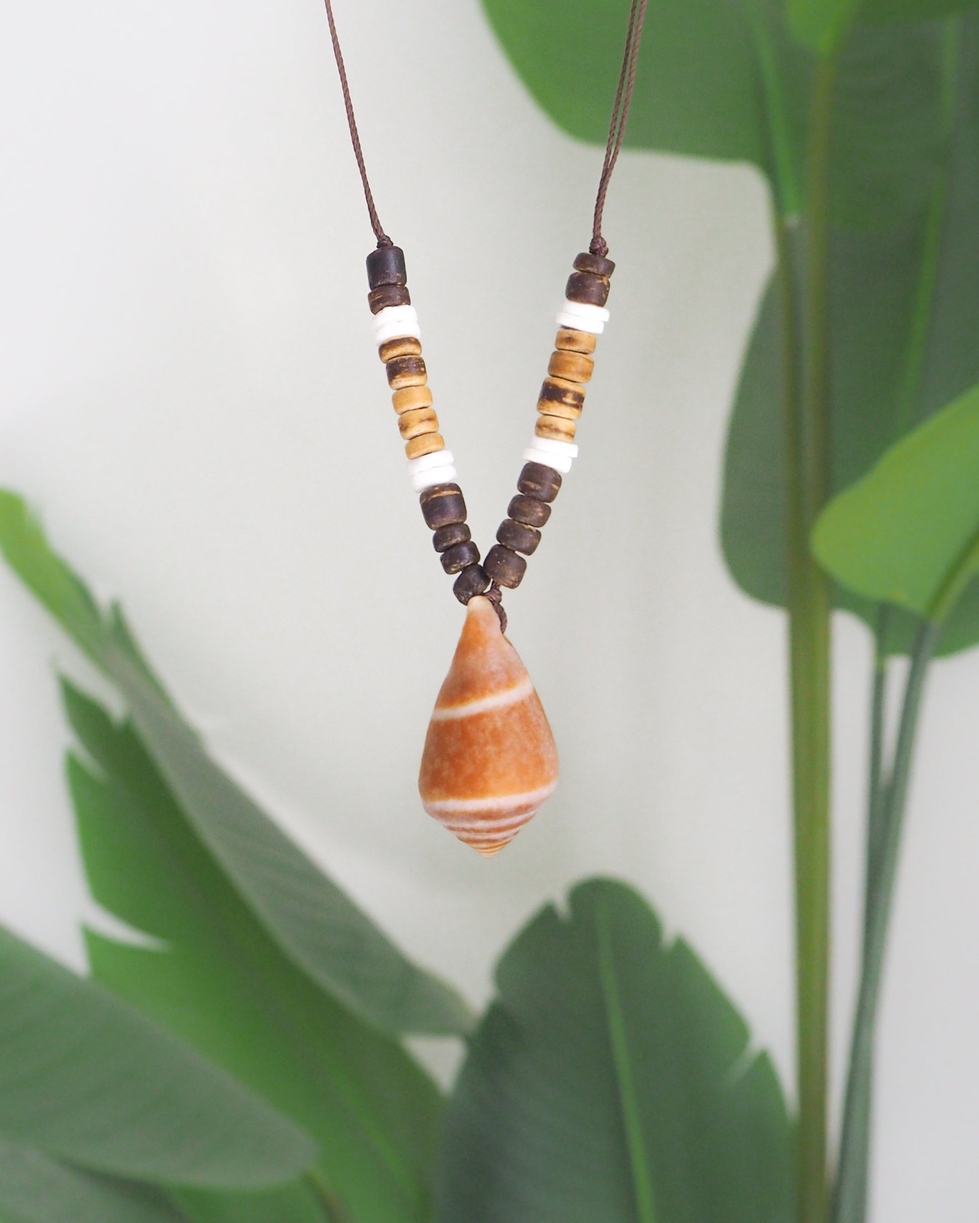 The natural tones of the Mediterranean Cone Shell perfectly compliments the dark and mid-brown coconut wooden beads, combined with natural white shell accents.