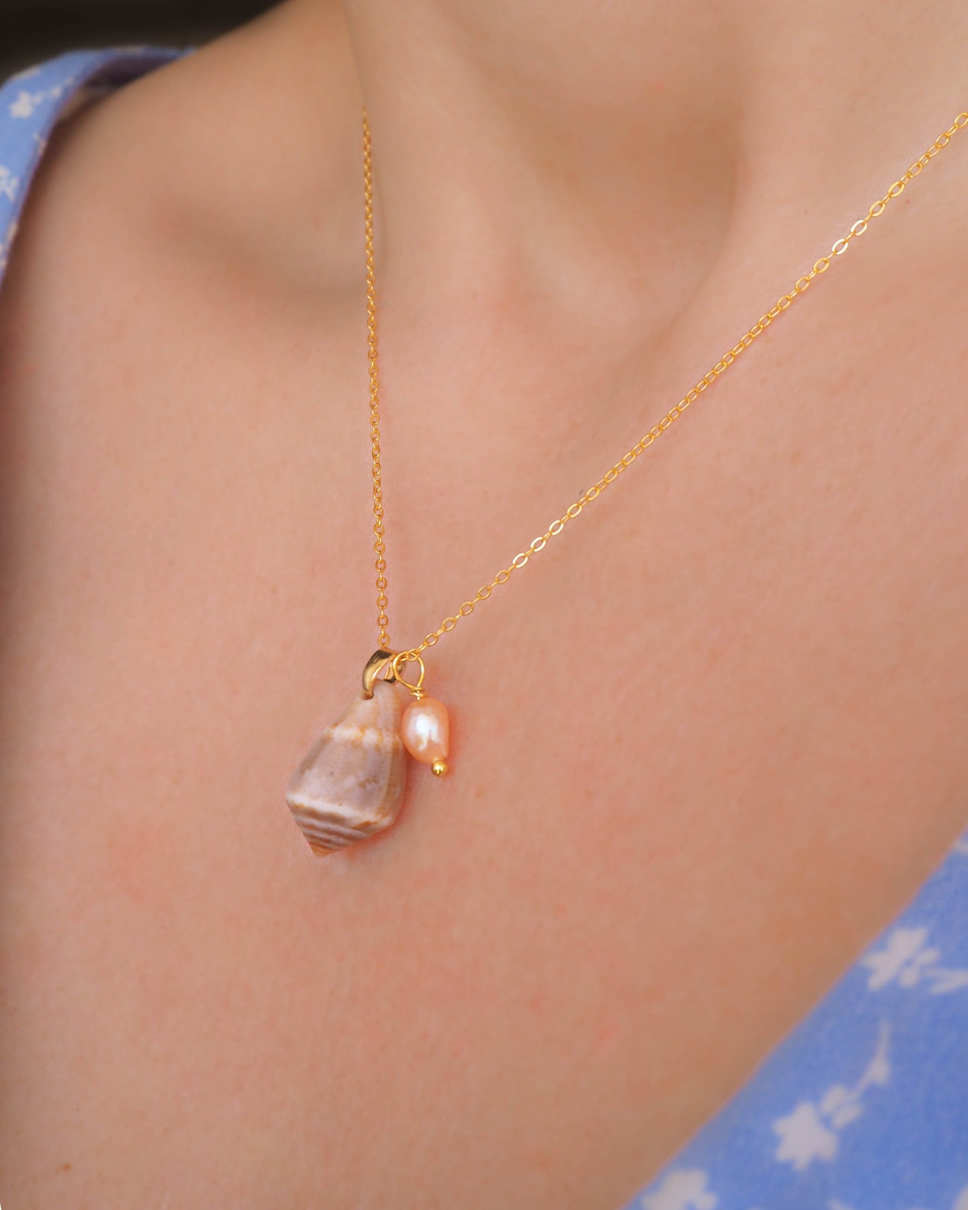 Step into a world of the beauty of nature with this Gold Cone Shell Pearl Necklace. 🐚✨