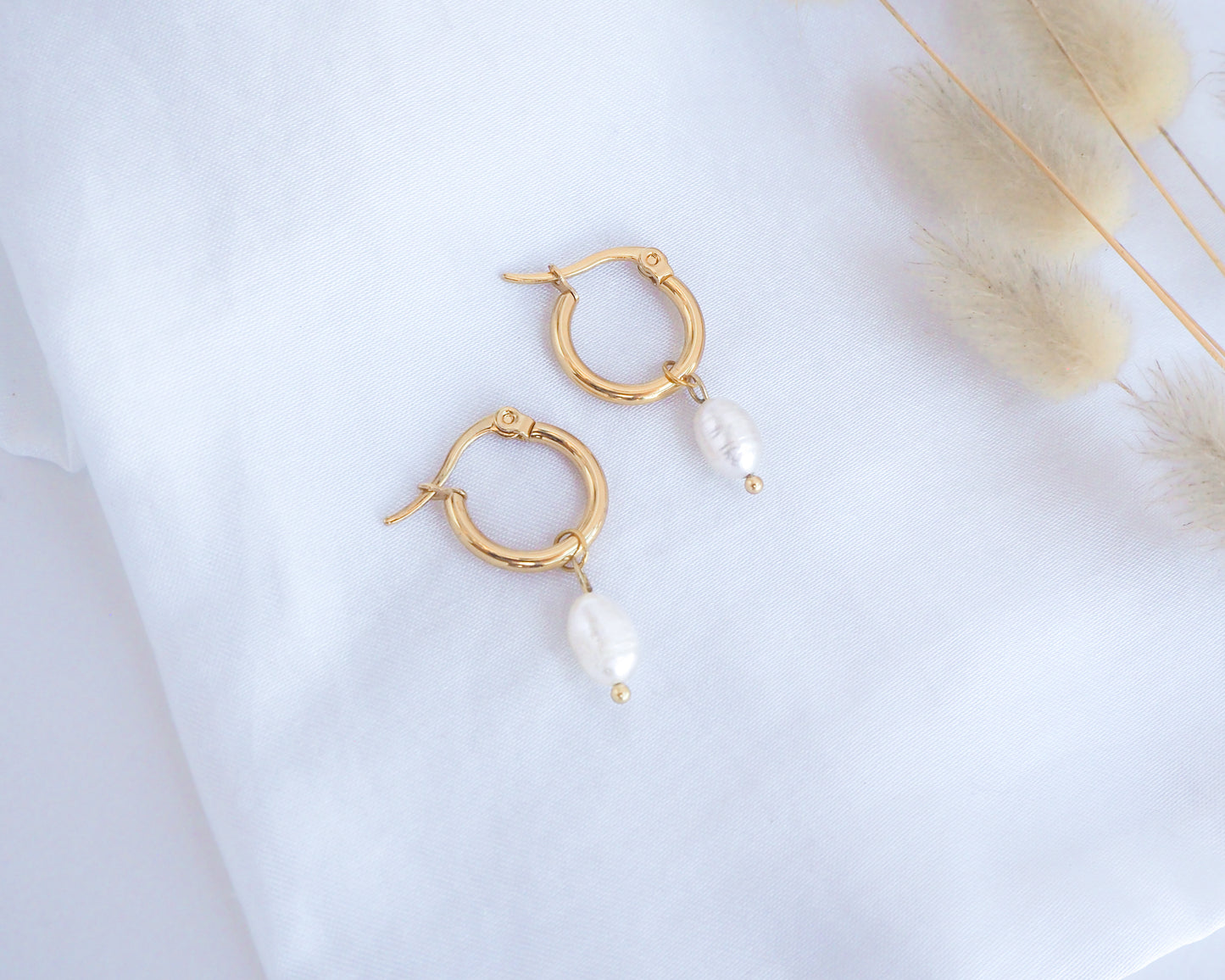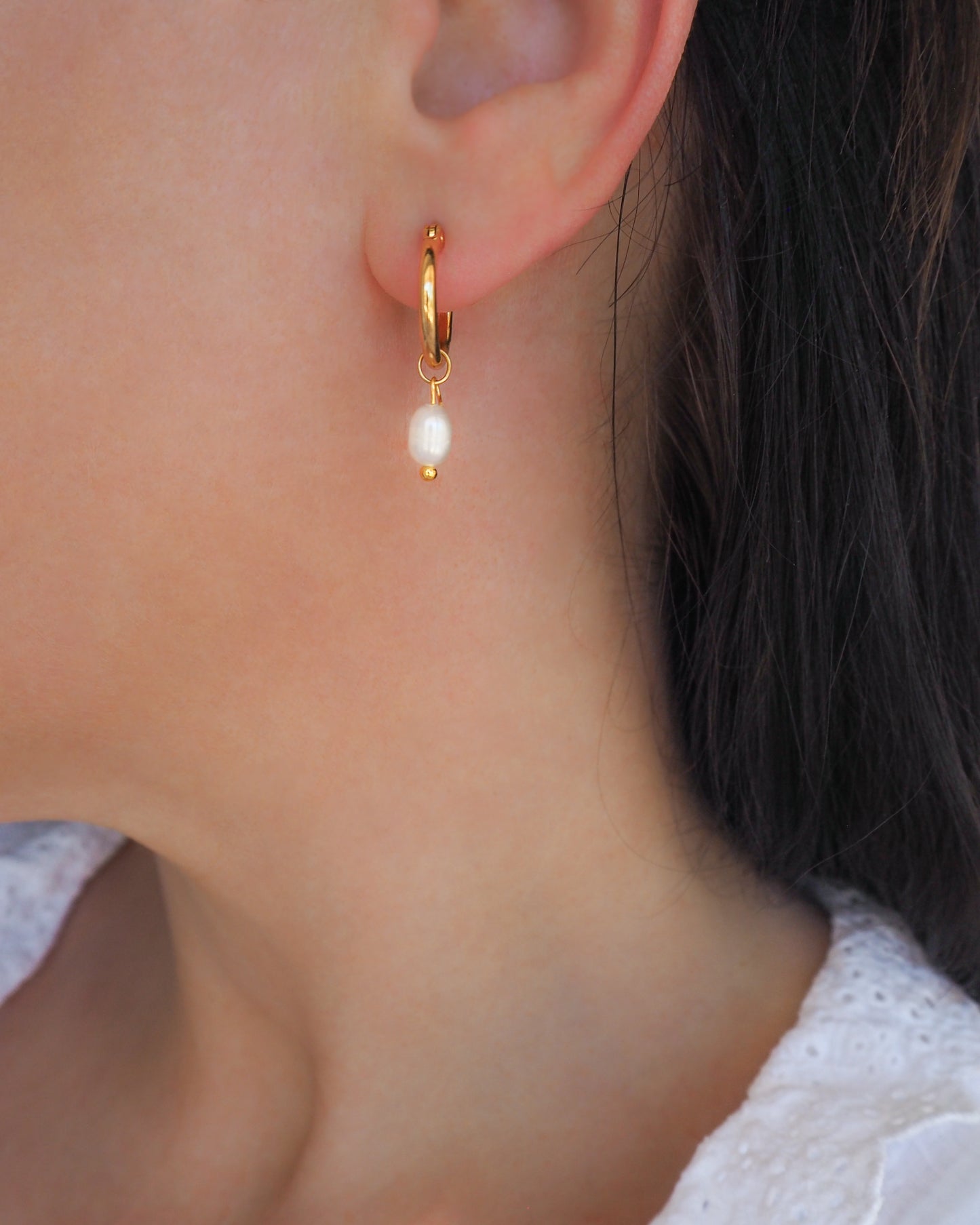 These Gold Ivory Freshwater Pearl earring hoops are made from high-quality 18k gold plated stainless steel and paired with a freshwater pearl, symbolizing purity and sophistication.