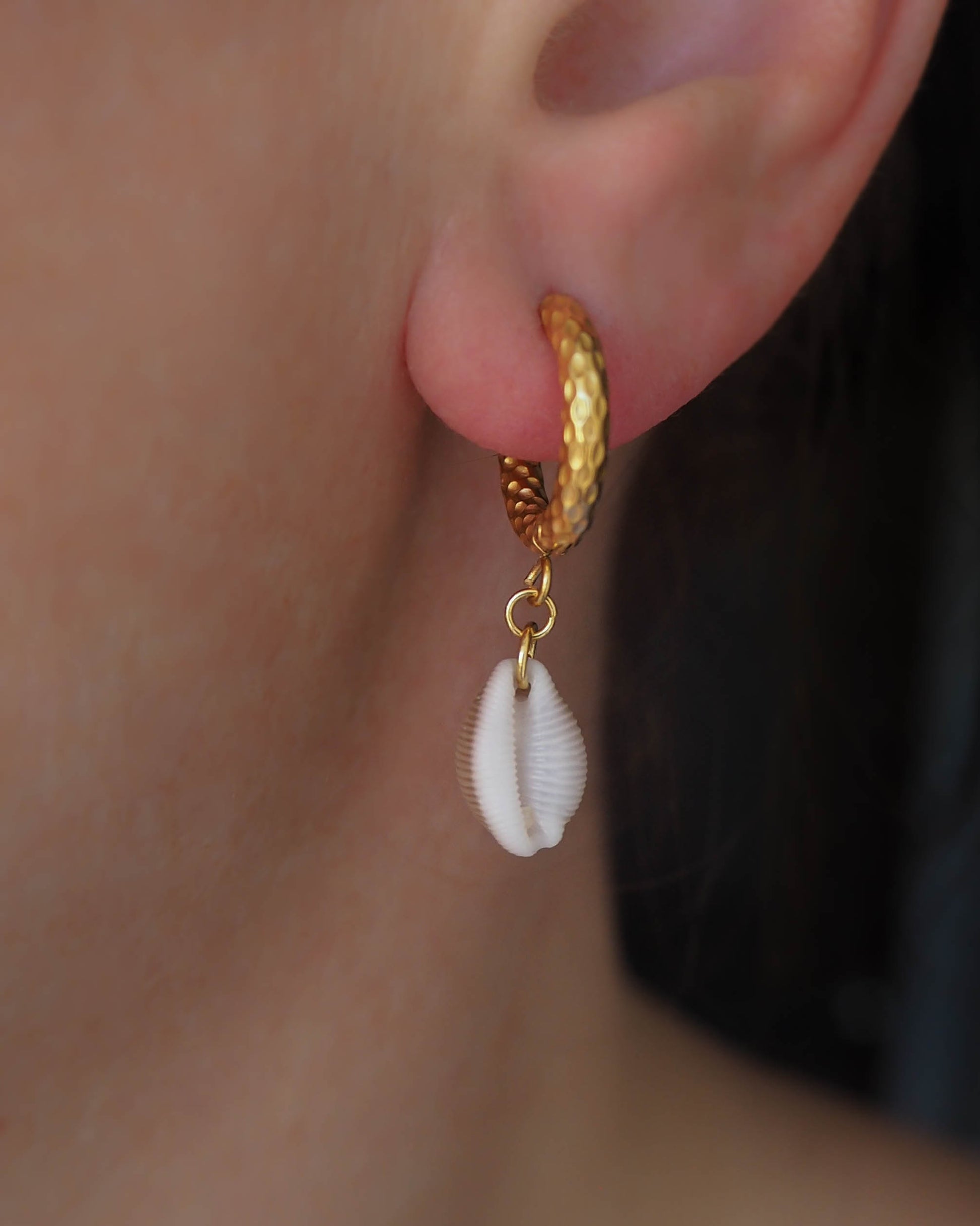 The natural reef textures and coastal charm of the 18k gold stainless steel earring hoops perfectly compliments the Cowrie Shells.