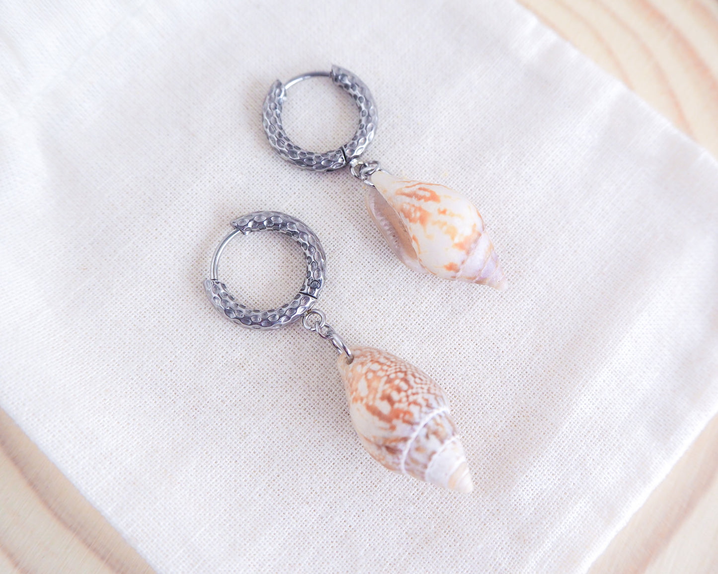 The natural reef textures and coastal charm of the silver earring hoops perfectly compliments the two unique Rustic Dove Shells, found by me from the beach of Algarve, Portugal.
