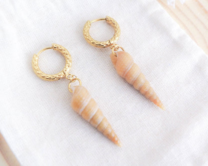 The natural reef textures and coastal charm of the stainless steel earring hoops perfectly compliments the Common Tower Shells.