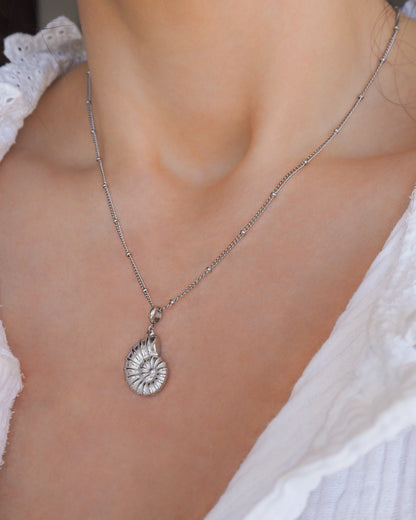 This necklace features a beautifully crafted nautilus shell or SEA BY LOU shaped pendant, made from high-quality silver stainless steel that is both durable and timeless.
