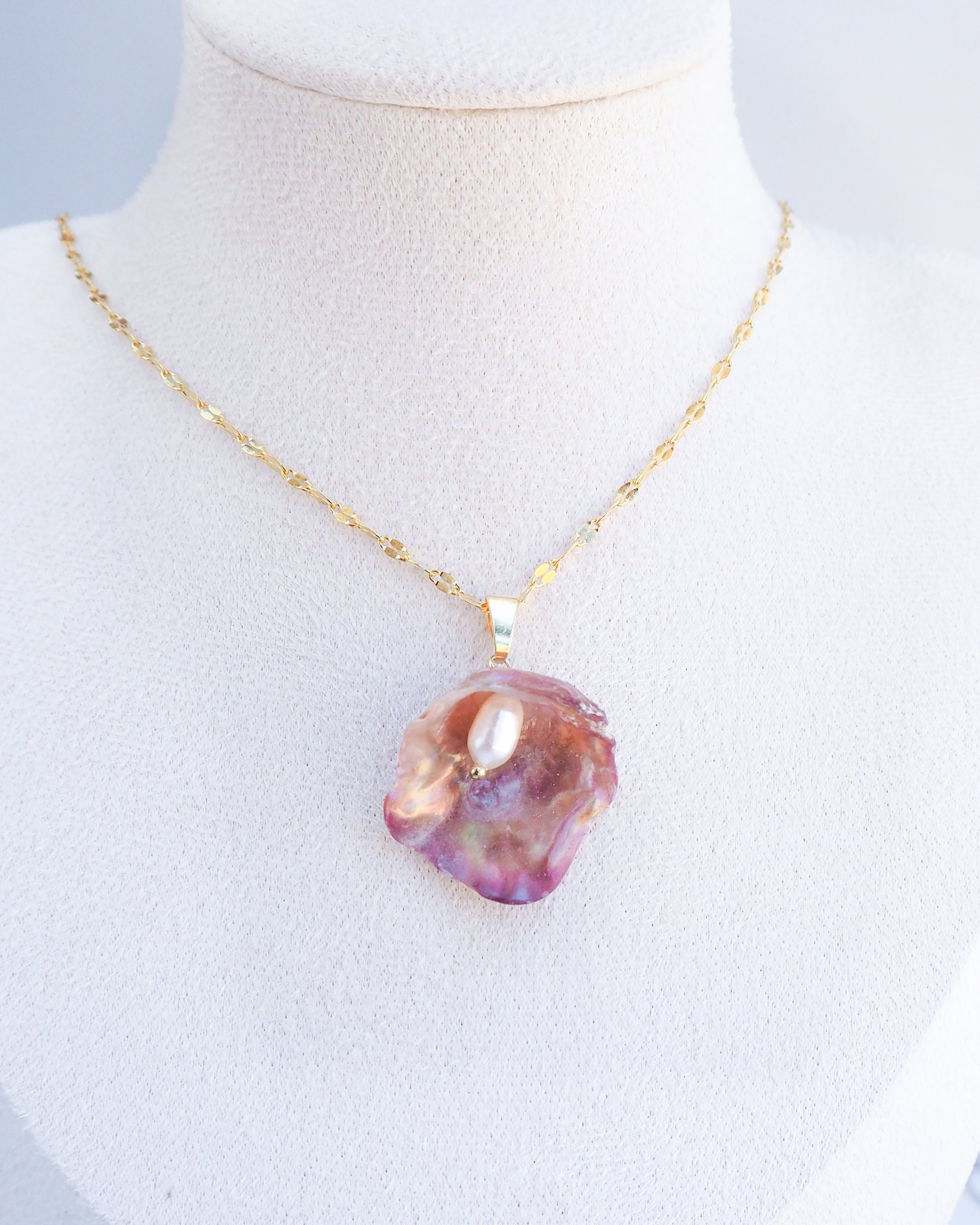 This gold necklace beautifully combines the freshwater pearl with the natural elegance of a Jingle Shell. 🐚