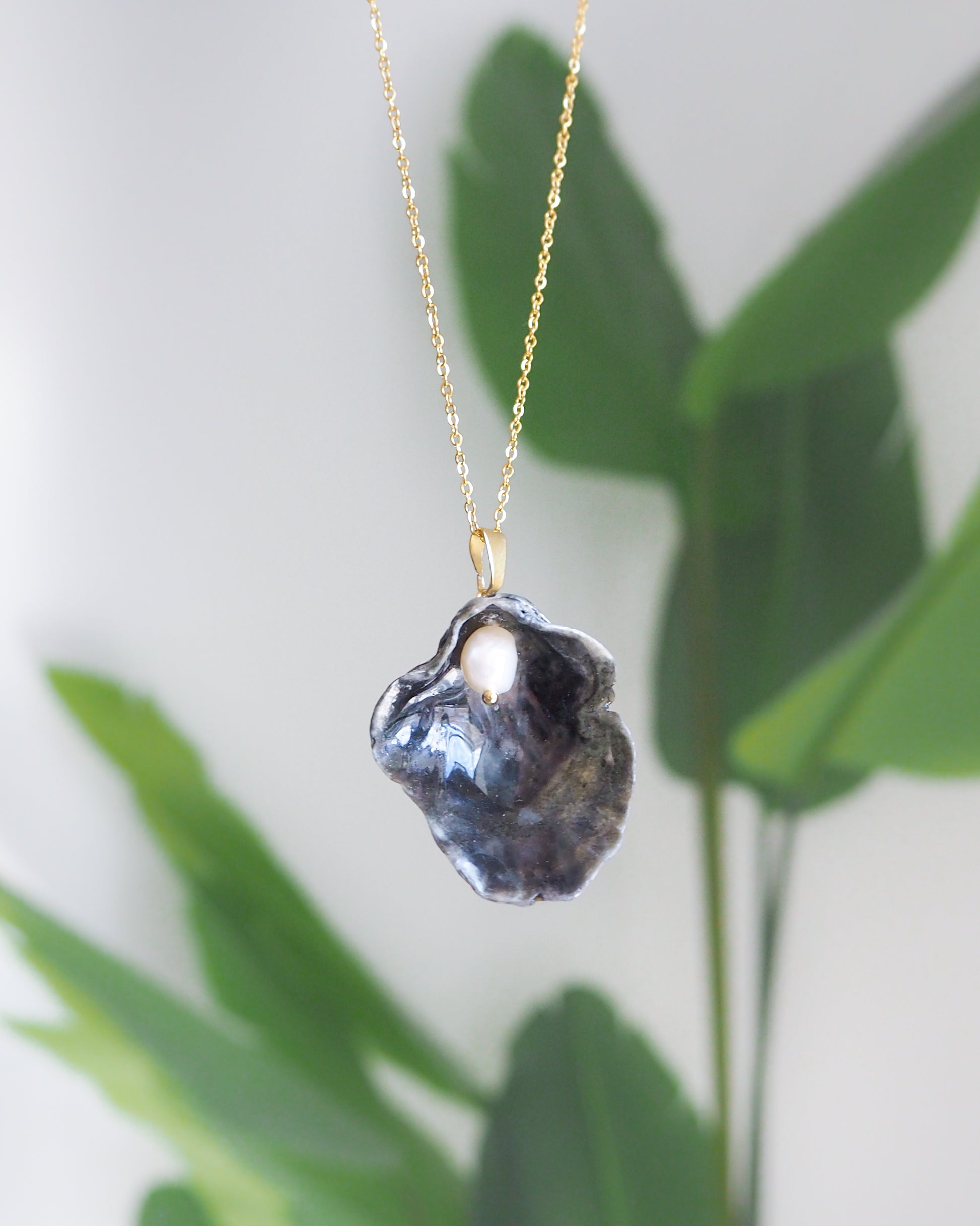 The deep, iridescent tones of the dark mother-of-pearl Jingle Shell || Anomia ephippium contrast beautifully with the warm glow of the gold chain and freshwater pearl, creating a unique piece that radiates natural beauty and elegance.