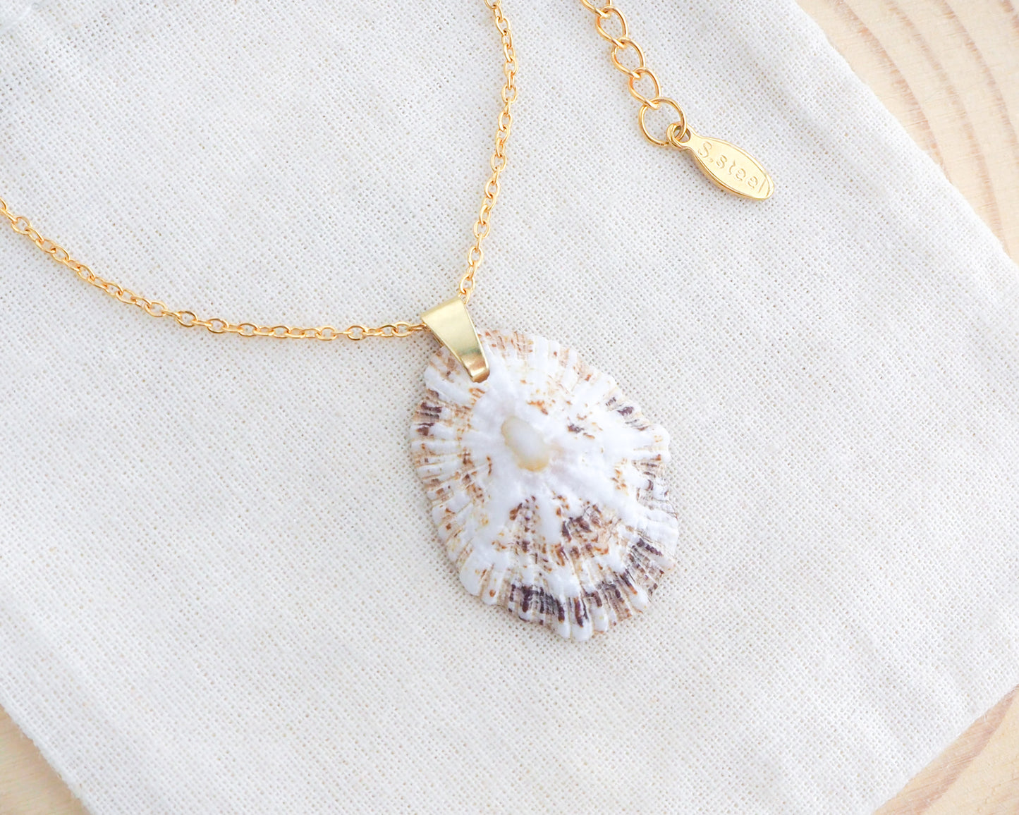 This shell showcasing the ocean's hidden treasures and complements the shimmering gold stainless steel necklace chain.