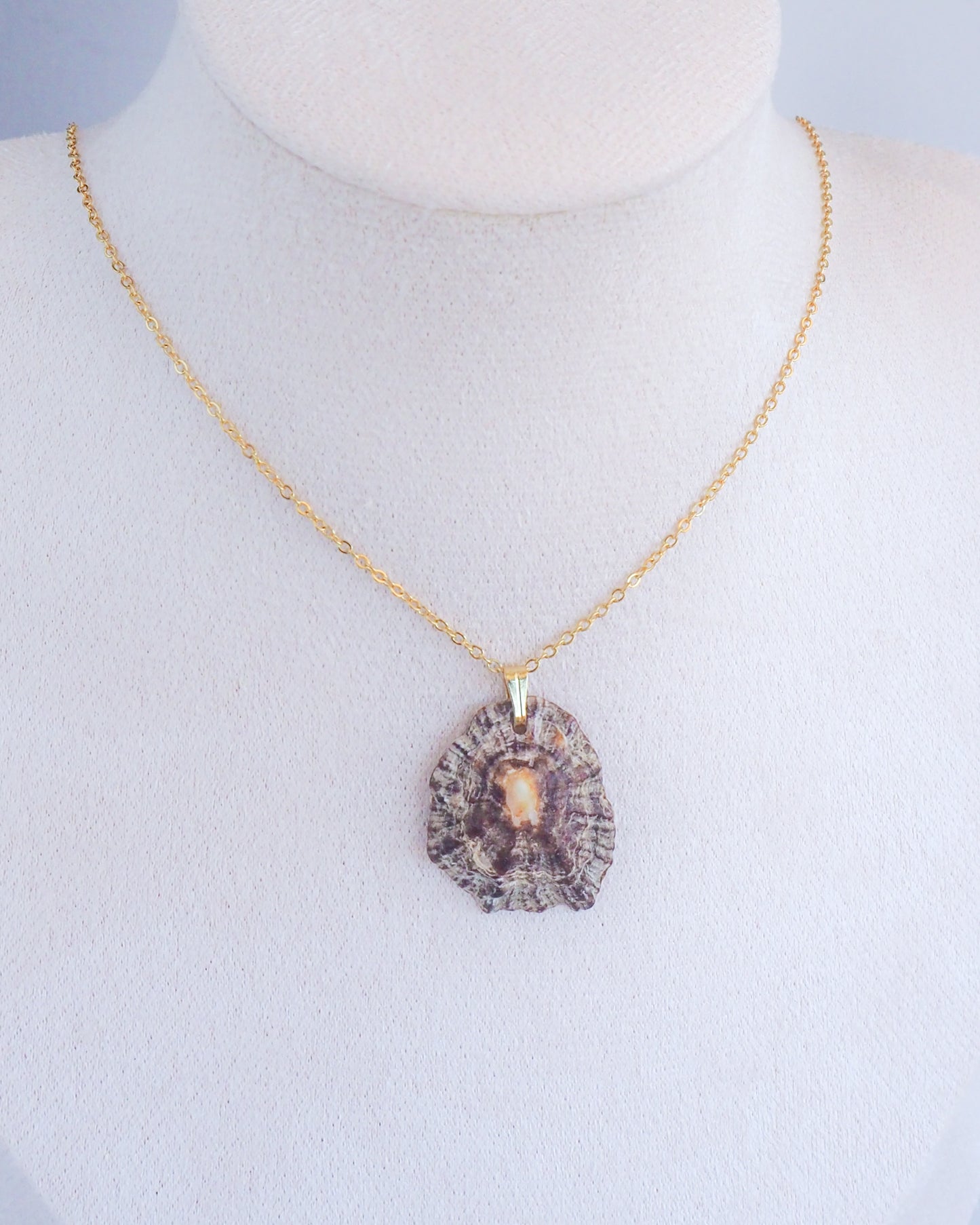This necklace is adorned with a Mediterranean Limpet Shell found on the beach of Portugal. This shell showcasing the ocean's hidden treasures and complements the shimmering gold stainless steel necklace chain.