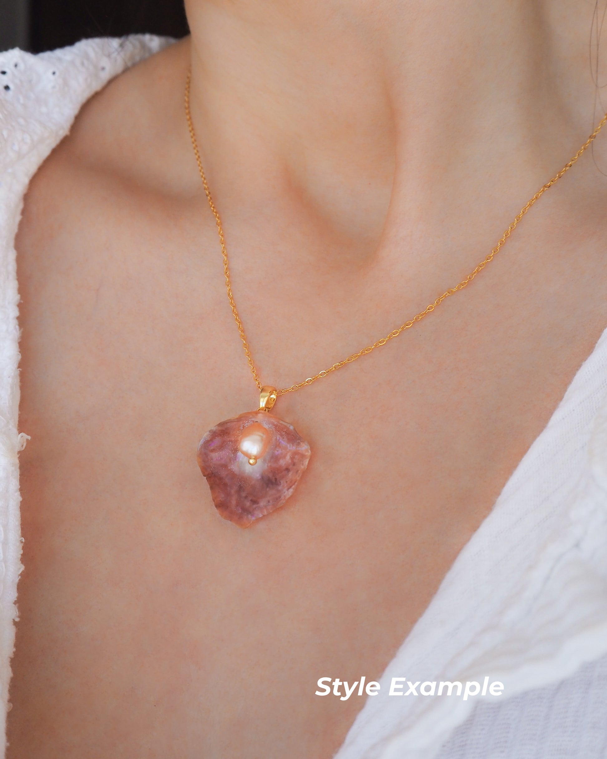 This gold necklace beautifully combines the lilac freshwater pearl with the natural elegance of a pink fuchsia Jingle Shell. 🐚