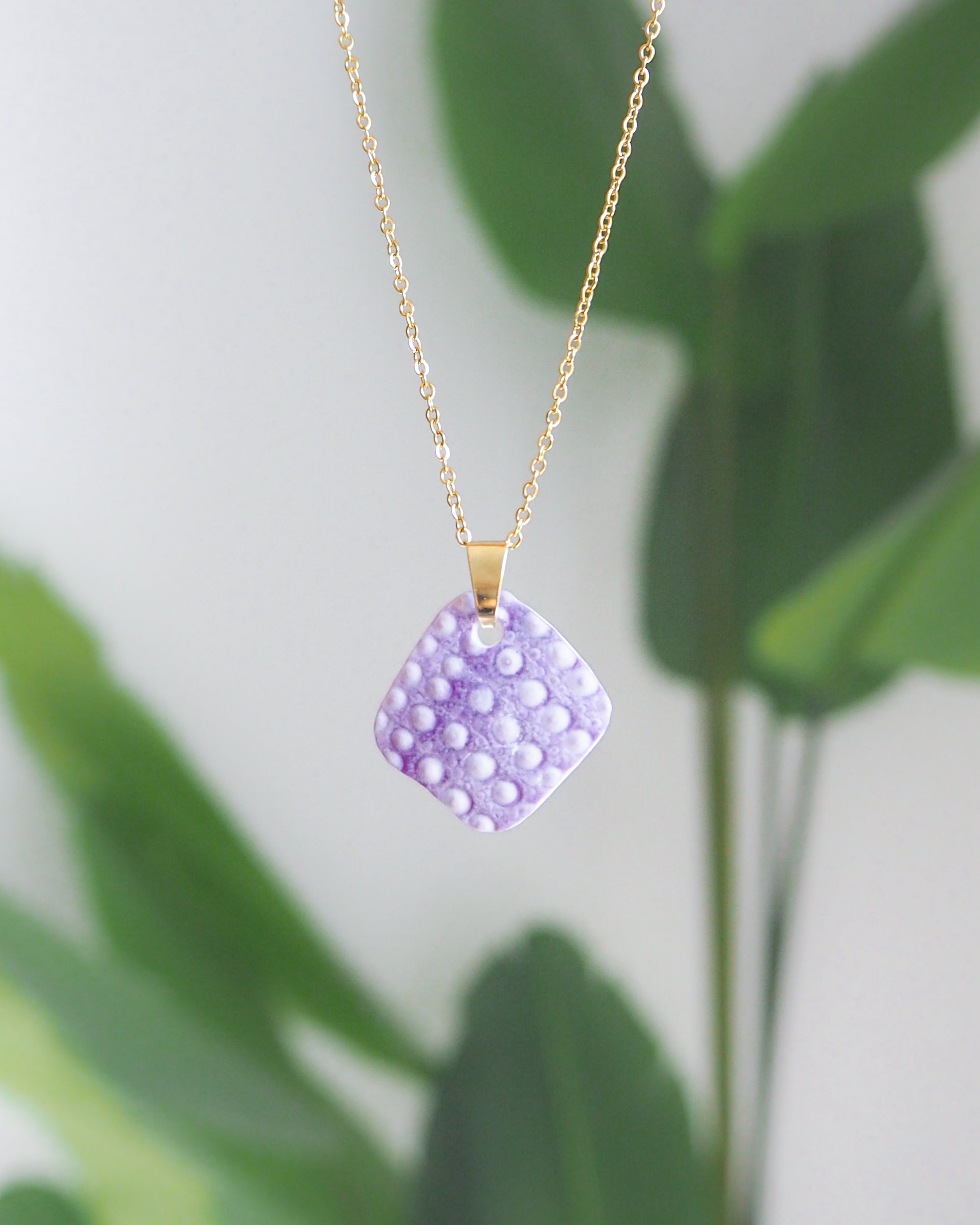The unique piece of Sea Urchin is polished by the waves of the ocean. The beautiful lilac purple color perfectly compliments the gold plated stainless steel chain. ✨