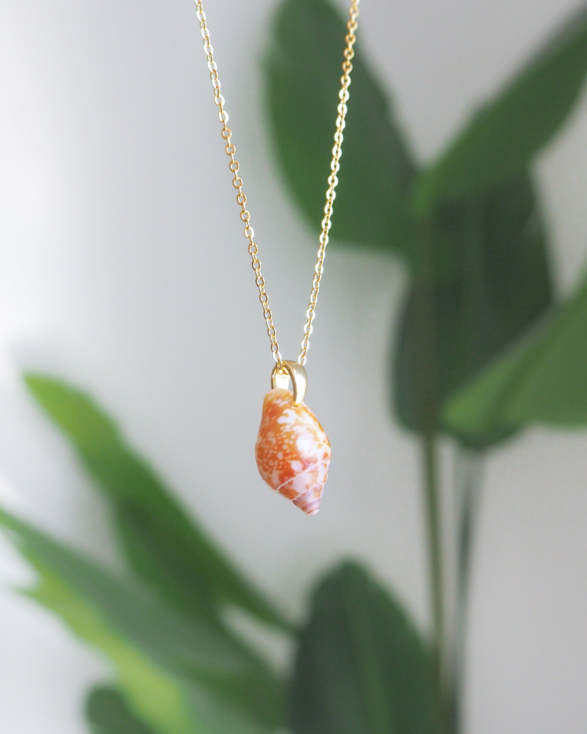 The Rustic Dove Shell is a true treasure of the sea that's complemented with the shimmering gold stainless steel necklace chain.