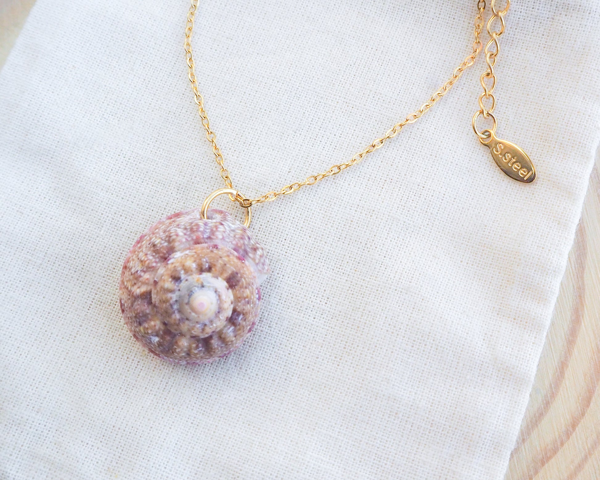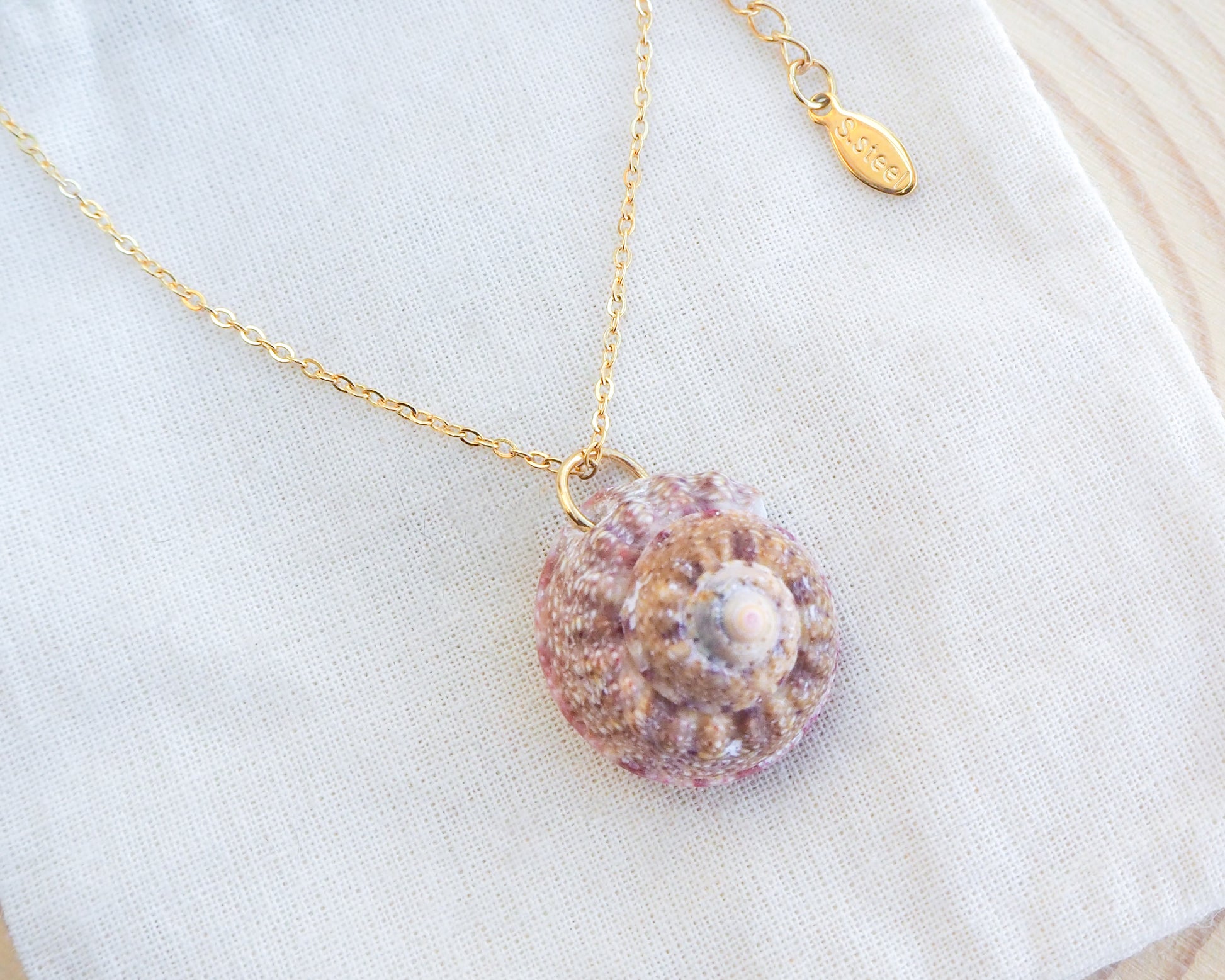 The unique hues and pattern of this Magus Top Shell are a testament to the rich coastal palette found along Portugal's beaches and complements the shimmering gold stainless steel necklace chain.✨