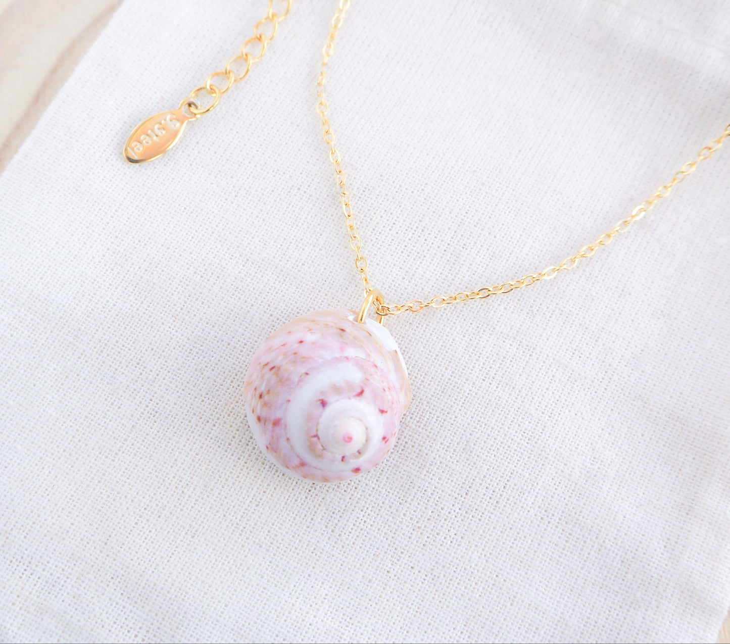 The unique hues and pattern of this pink Magus Top Shell are a testament to the rich coastal palette found along Portugal's beaches and complements the shimmering gold stainless steel necklace chain. 🌸✨