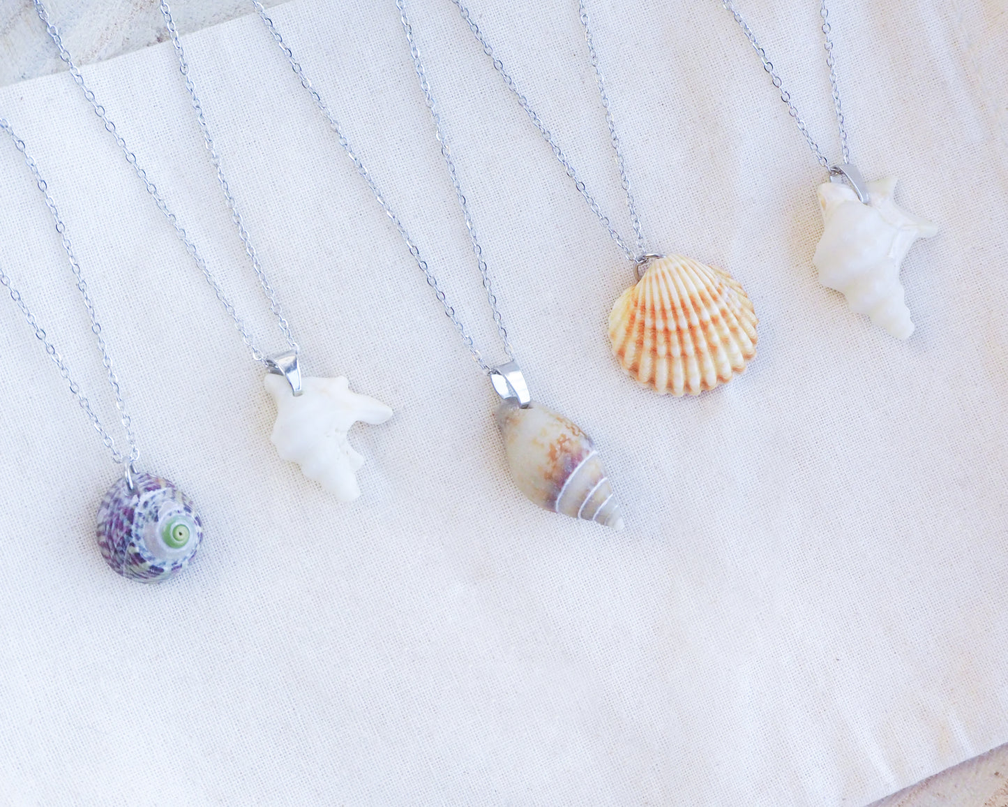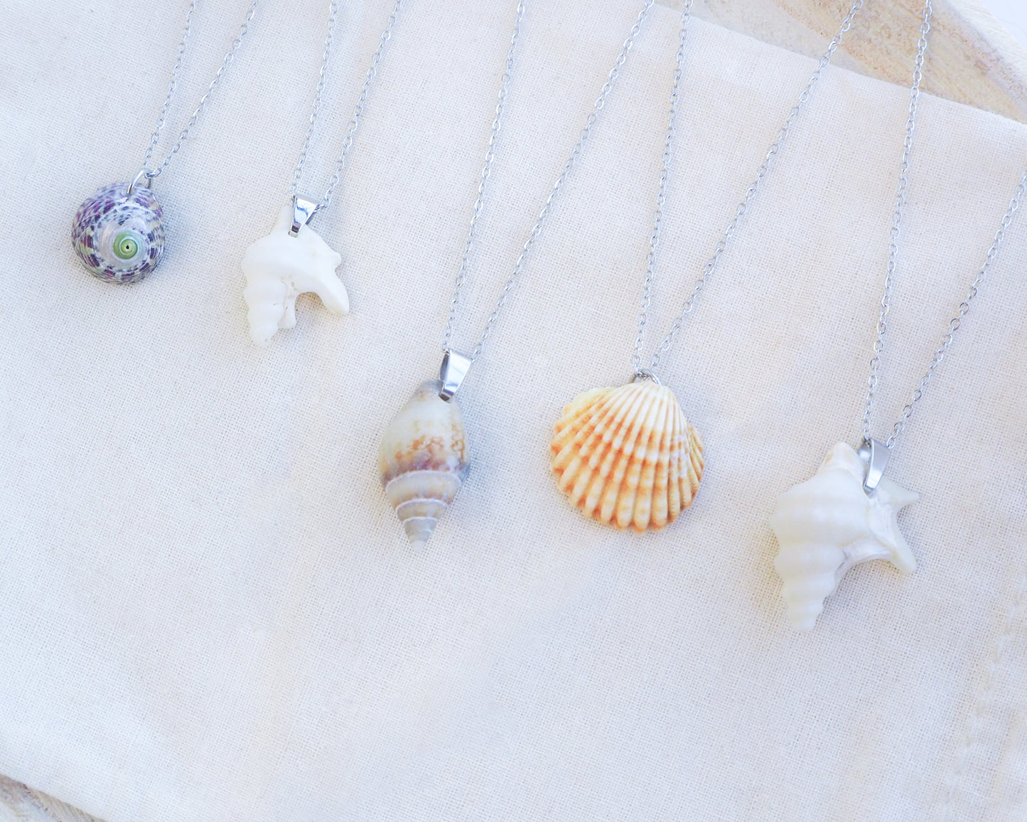 The Rustic Dove Shell is a true treasure of the sea that's complemented with the silver stainless steel necklace chain.