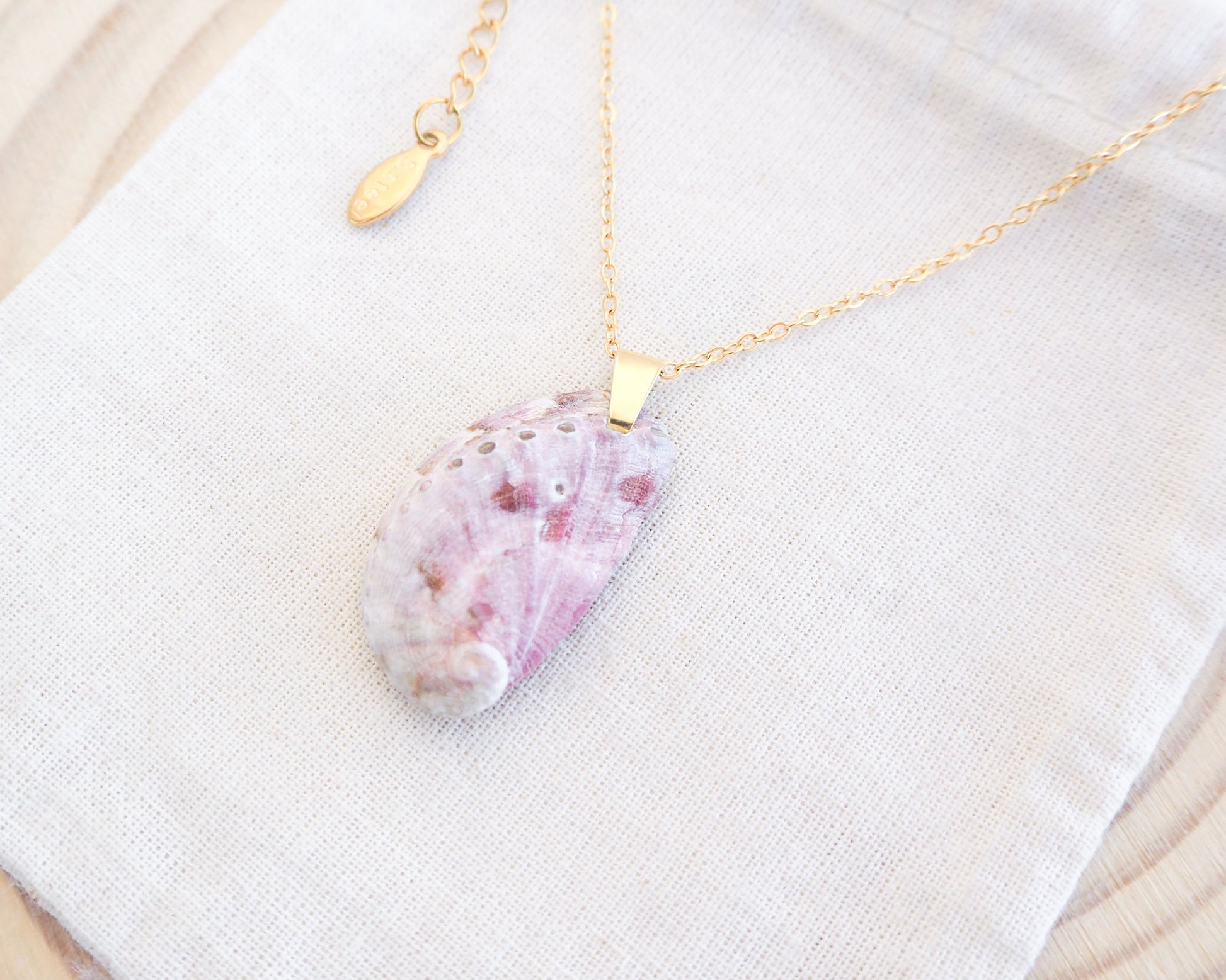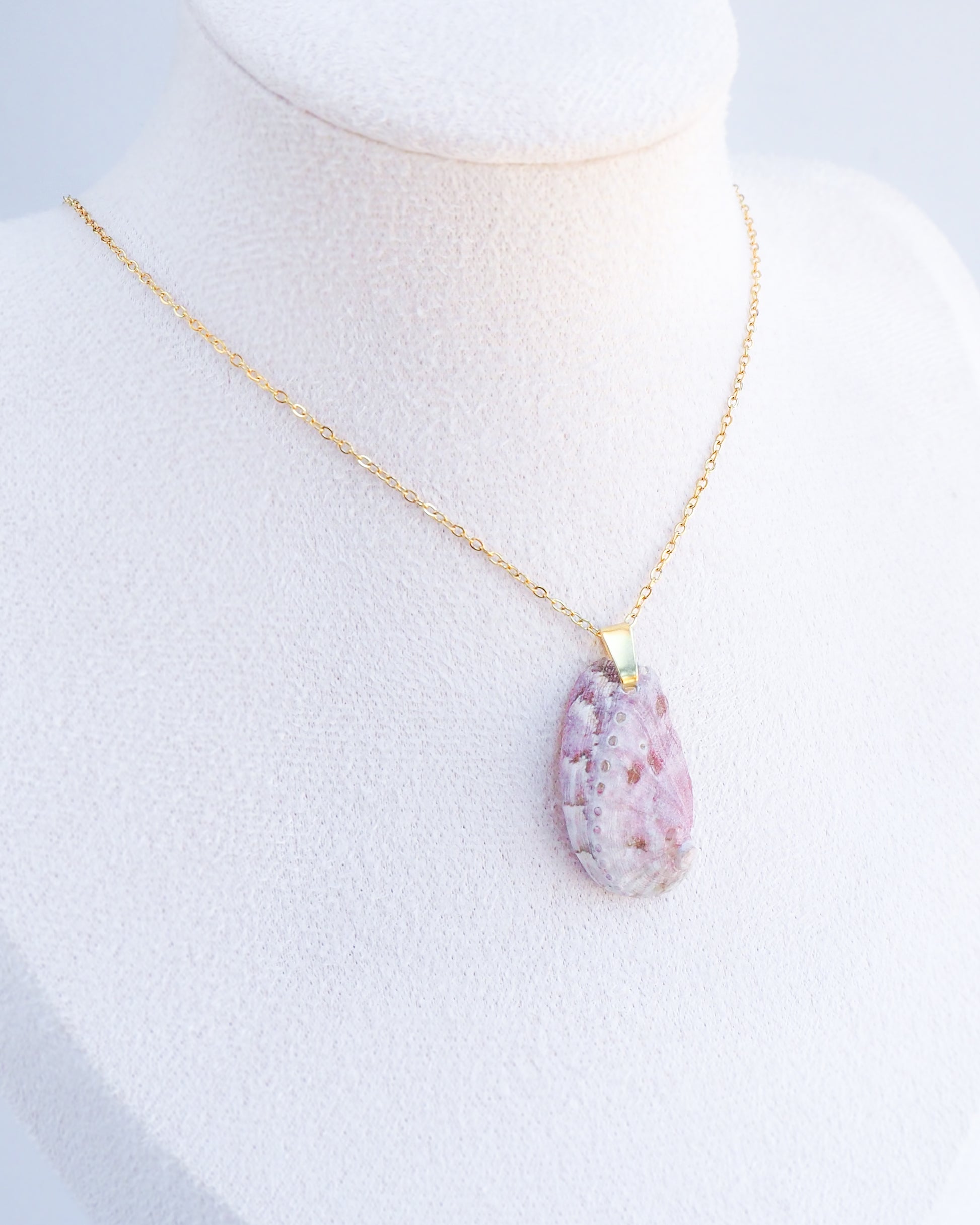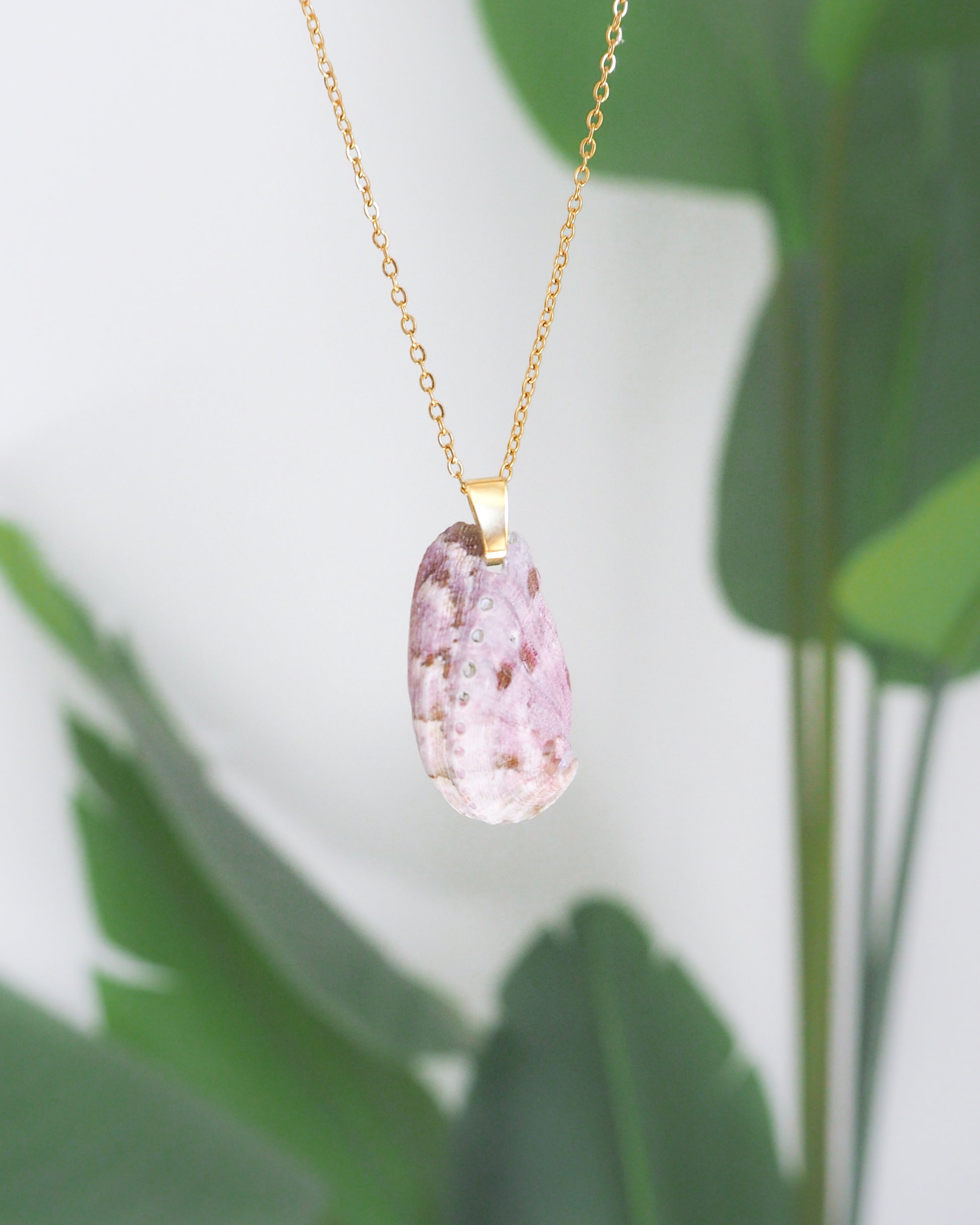 The stunning soft lilac pink colored shell perfectly complements the shimmering 18k gold stainless steel necklace chain.