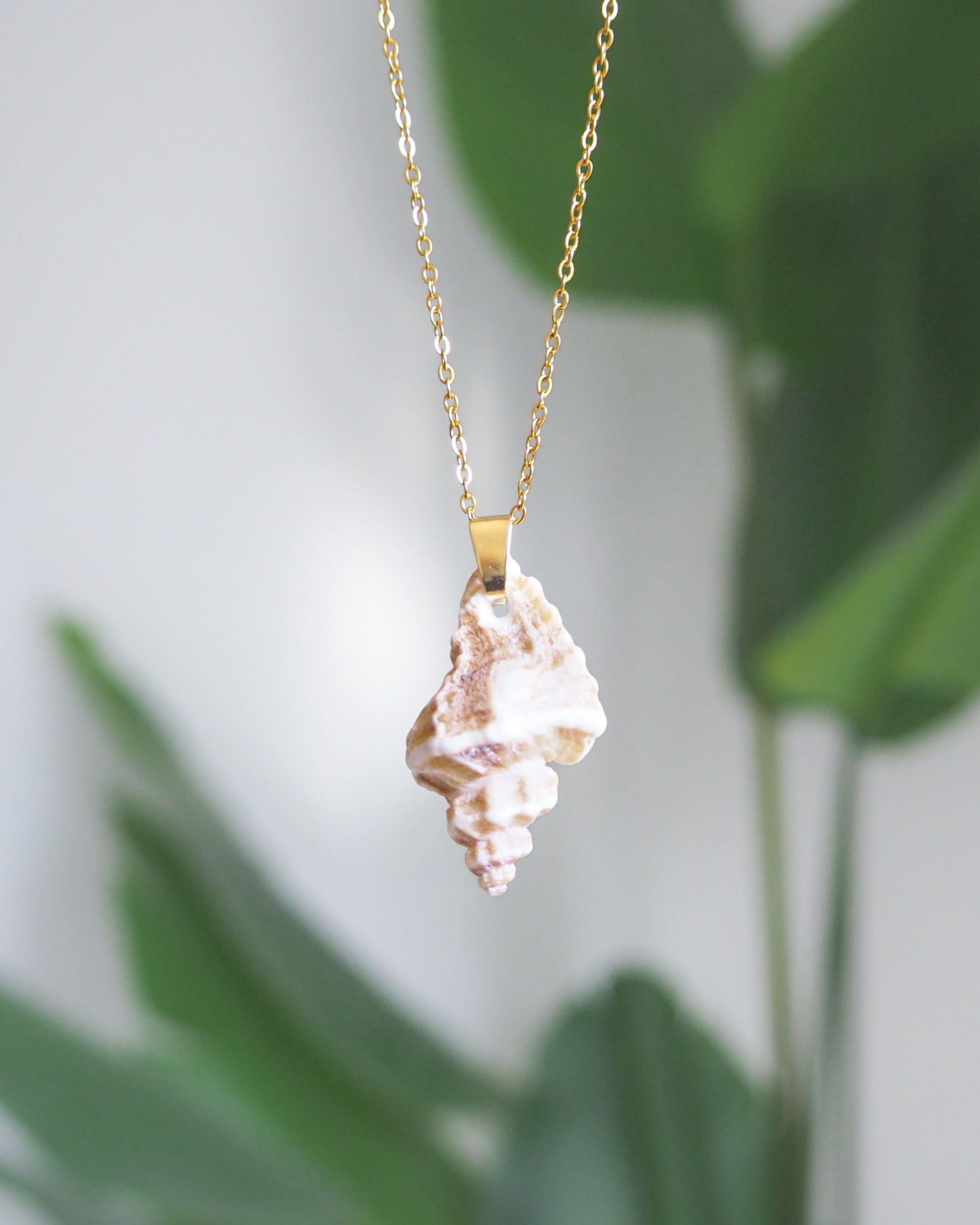 The natural textured Sting Winkle Shell perfectly compliments the shimmering gold necklace chain.