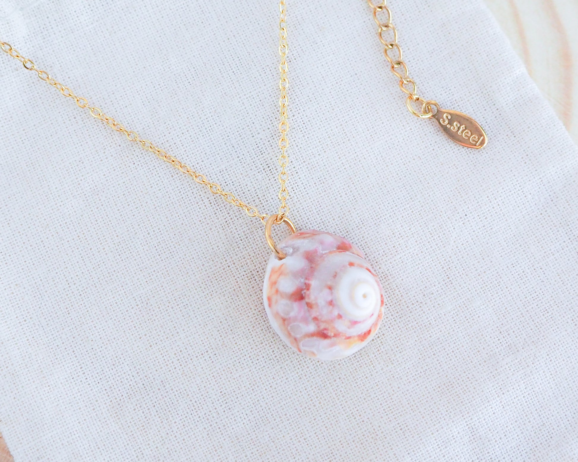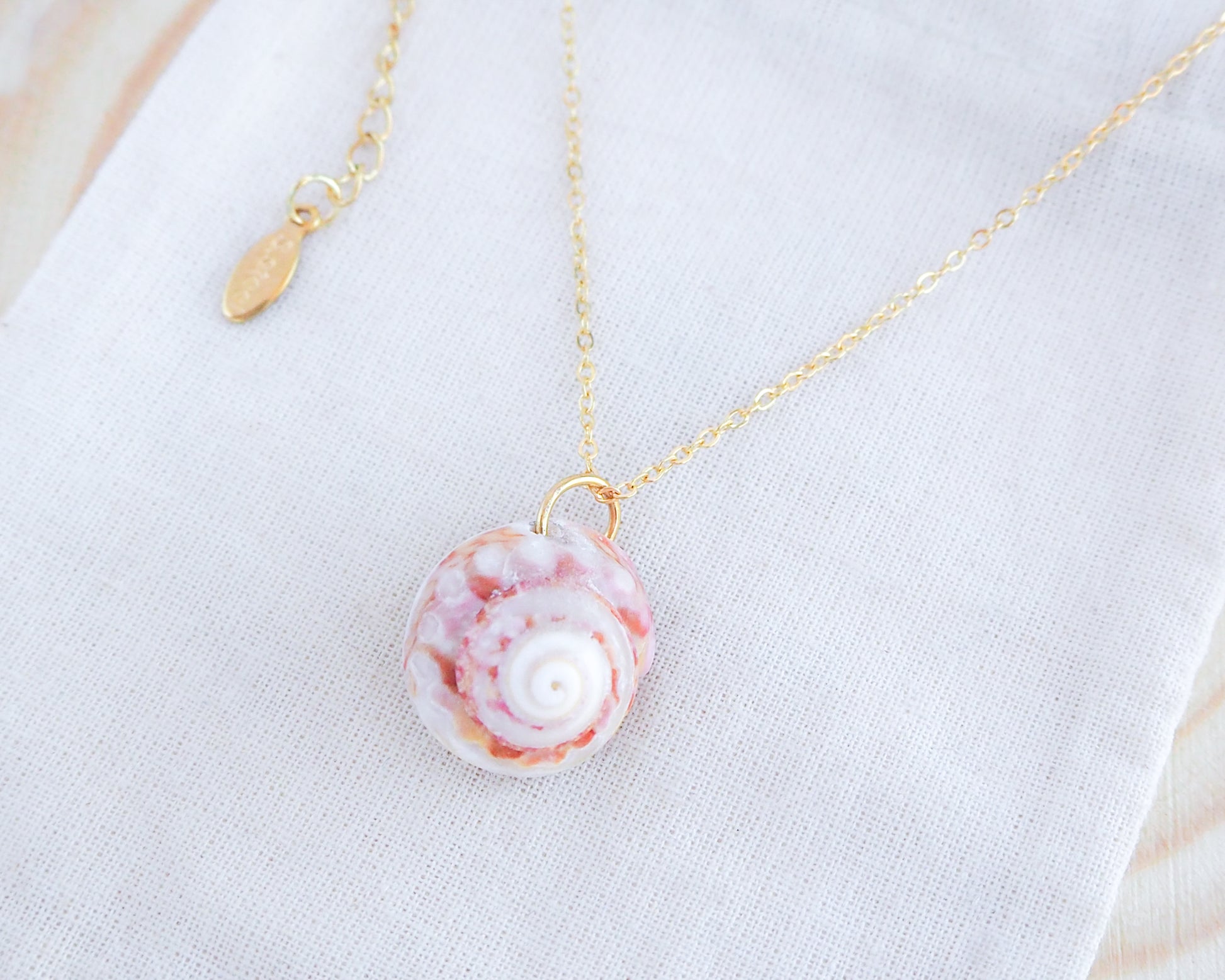 The unique hues of this summer sun colored Magus Top Shell are a testament to the rich coastal palette found along Portugal's beaches and complements the shimmering gold stainless steel necklace chain.✨