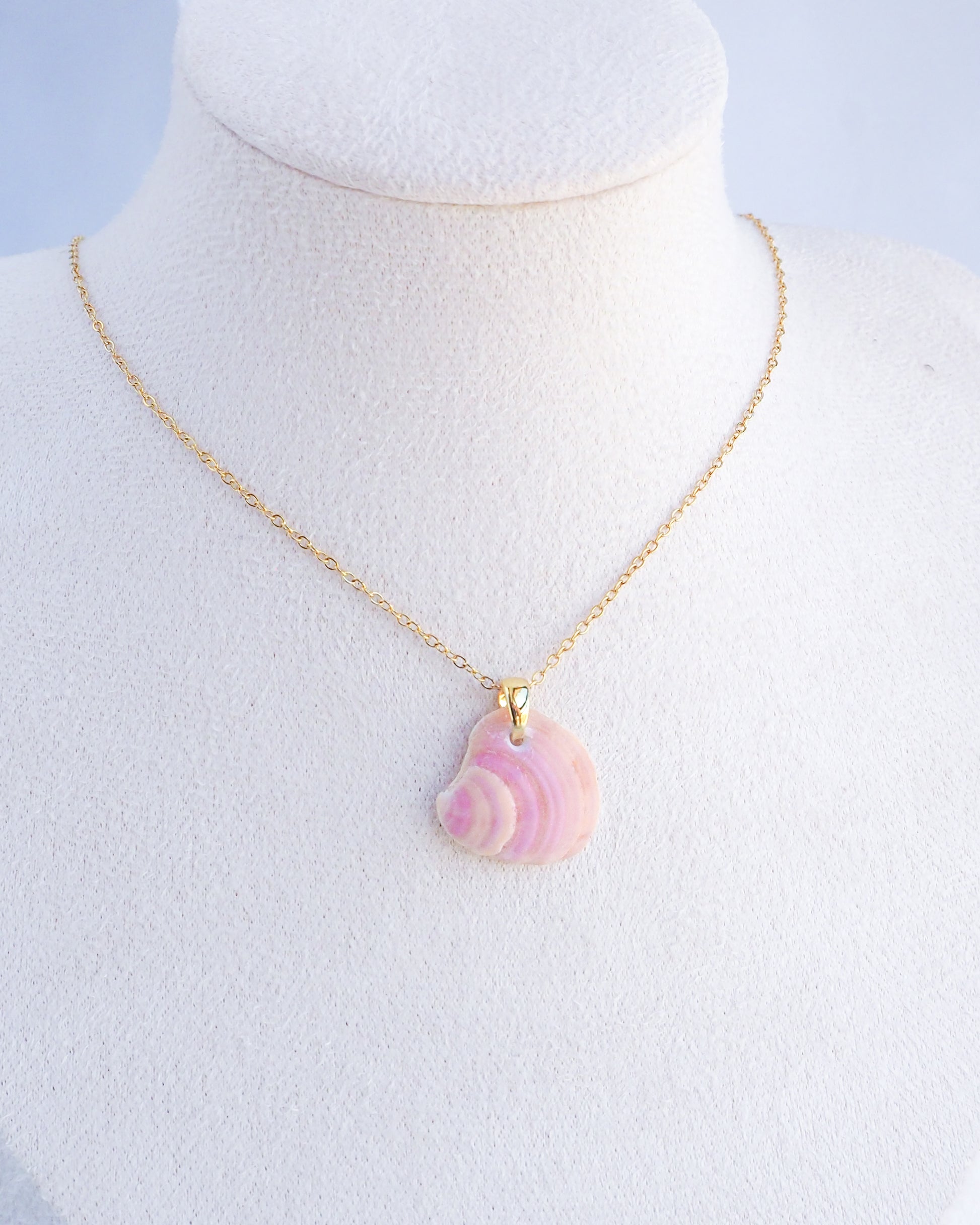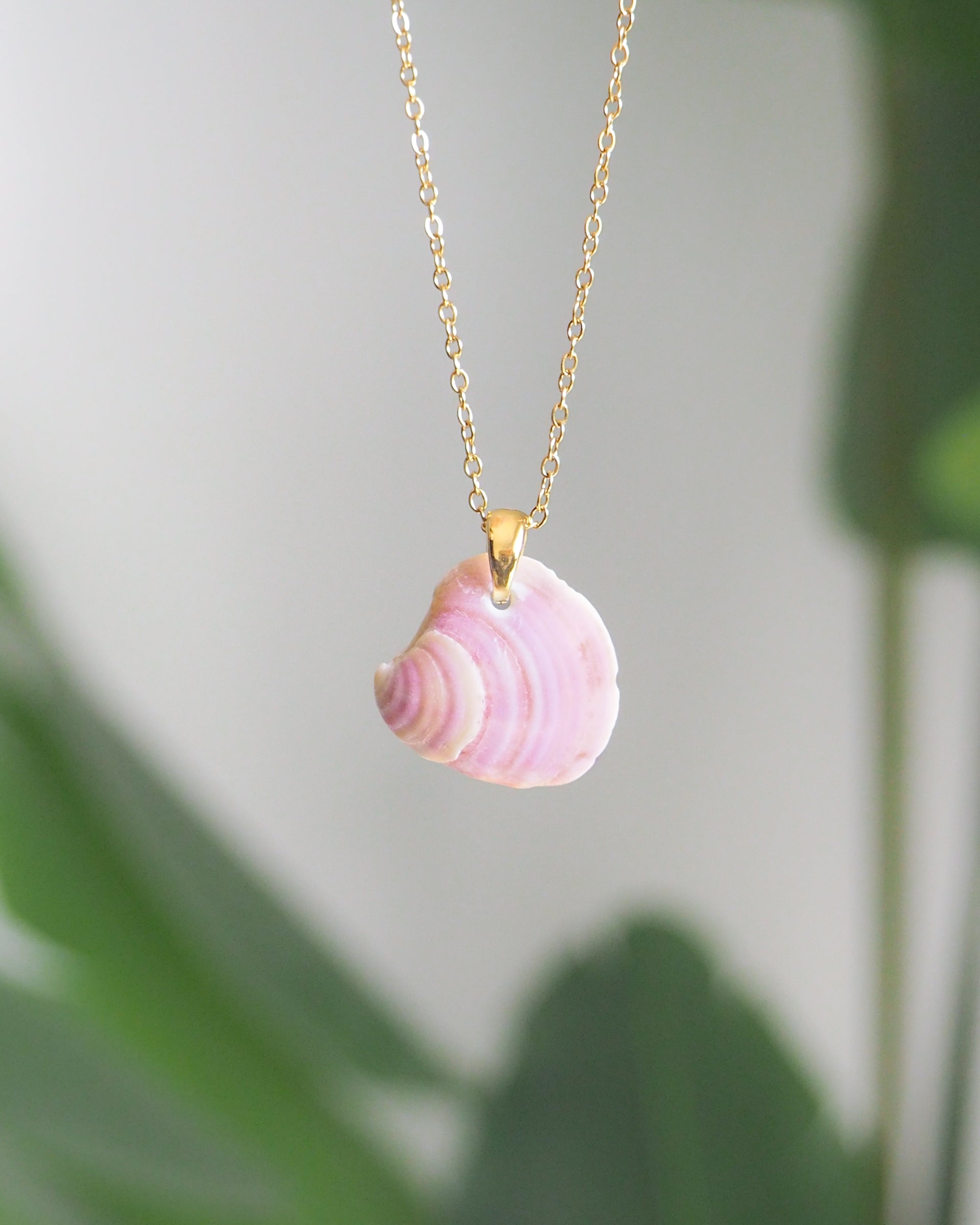 The stunning pink colored shell perfectly complements the shimmering 18k gold stainless steel necklace chain.